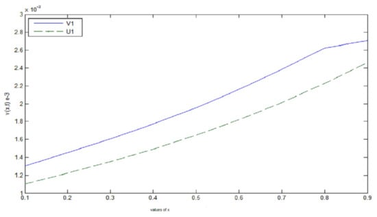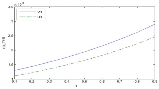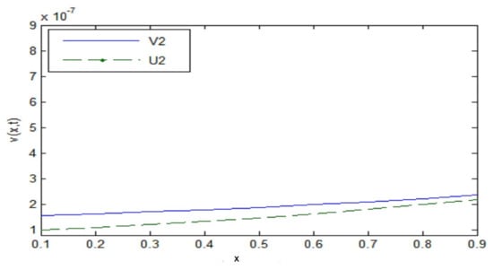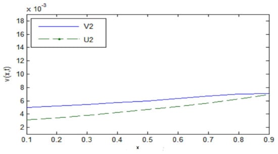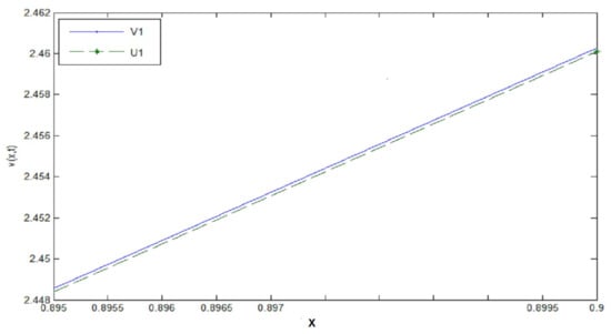 The Figure A3, Figure A4, Figure A5 show where the space step is fixed at and the time step decreases towards zero , the approximate solution tends to the exact solution , in the case where we see that the two curves of and are almost identical.