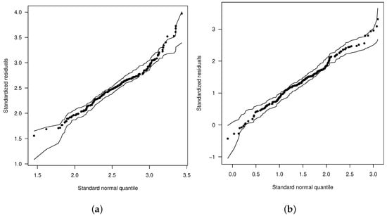 The estimation of the parameters follows the same routine as in the case of the UPSN model; likewise, the information matrix of this model can be obtained from the information matrix of the UPSN model. It is enough to change to in the respective expressions. For this model, in the case of inflation at zero and/or one, that is, in the intervals, , , and are used for the discrete part—a random variable binomial under a logit link function, similar to the case of the UPSN model.