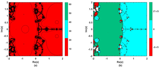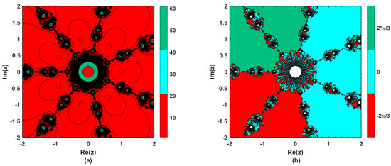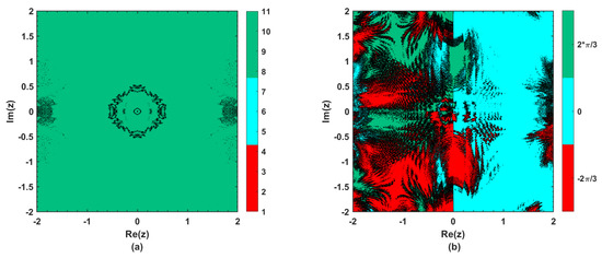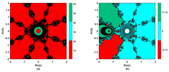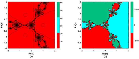 The above functions were selected, randomly containing both complex polynomials and transcendental functions. Graphs were obtained with MATLAB R2020a within taking and , where k refers to the maximum number of iterations chosen. It should be noted that the region R is the phase-space wherein the basins of attractions are plotted under PS9 for the complex-valued functions described in Example (1). As seen in Figure 1, Figure 2, Figure 3, Figure 4, Figure 5 and Figure 6, the highest number of iterations is required by those initial guesses that are at or near the boundaries (black lines in the figures). When the initial guess is taken within a small neighborhood of the exact solution, then the minimum number of iterations is needed. While running the simulations to obtain the fractal structures shown in Figure 1, Figure 2, Figure 3, Figure 4, Figure 5 and Figure 6, we computed the total average time (seconds) required by PS9 for the complex functions under consideration, as given in Table 2. As observed, complex functions with higher degrees (in the case of polynomials) and hyperbolic functions are computationally more expensive.