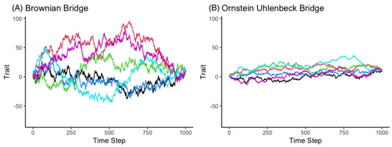While the PCMs developed for studying continuous trait evolution mainly use the Gaussian process family; there are also PCMs that use non-Gaussian processes to model trait evolution [36,37]. Those PCMs mainly serve as tools to address the questions from evolutionary biology. The two bridge models presented here merely serve as add-on tools to hopefully reveal useful information embedded in the past.