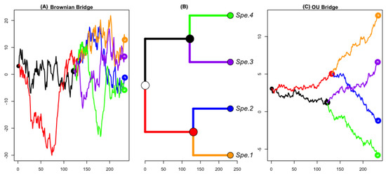 We then use Equation (25) to generate the trajectories of on each branch constraint on the topology of the tree . Sample paths generated under the bridge models along a four-taxa balanced phylogenetic tree is shown in Figure 2.