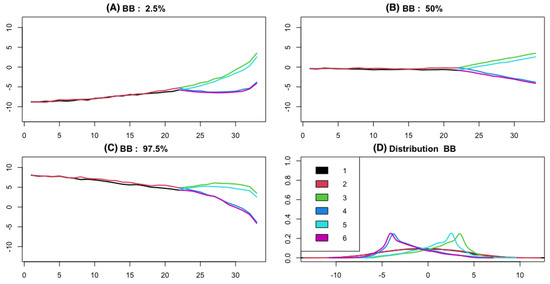 The skewness computed by and the kurtosis computed by using replicates for the six branches are reported in Table 1. In this trial, the distributions of trajectories under the Brownian Bridges model for branch 1 (black: from time 0 until branching) and for branch 2 (red: from time 0 until branching) are more symmetric () but platykurtic (), for branch 3 (green) and branch 5 (sky blue) are negative skew () and kurtic (), and of branch 4 (blue) and branch 6 (purple) are positive skew () and kurtic (). The skewness for all samples is and the kurtosis for all samples is meaning that the distribution of the trajectories under the Brownian bridge model is symmetric and platykurtic (less outliers are produced than the normal distribution).