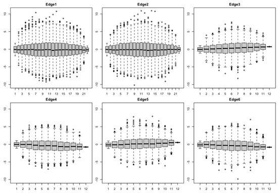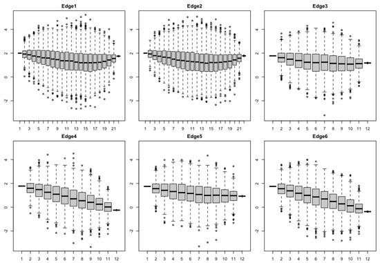 Boxplots for the 1000 samples simulated on each time grid on each edge under the Ornstein–Uhlenbeck bridge model.