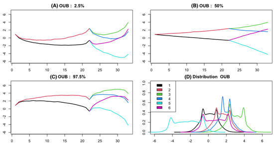 Trajectories mapping along a 4-taxa balanced phylogenetic tree under the Ornstein–Uhlenbeck bridge model. The mapping at the , and are shown at the plots (A), (B), and (C), respectively. The plot (D) shows the overall distribution of trajectories for each branch The six edges have length (steps) of sizes , respectively. The parameter is set to to generate the trajectories.