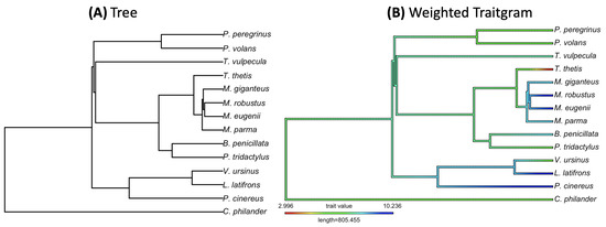 - Revell, L.J. Two new graphical methods for mapping trait evolution on phylogenies. Methods Ecol. Evol. 2013, 4, 754–759. [Google Scholar] [CrossRef]