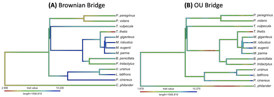The traitgrams using marsupial data under the Brownian bridge model and the OU bridge model are shown in Figure 8.