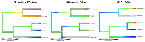 The Traitgrams using a smaller phylogeny of five taxa marsupial species are shown in Figure 9, where the visualization of color change along the edges of the tree are presented. In Figure 9, the traitgram using the weighted method [13] shows that change in trait values is in a monotonic manner; the traitgram using the Brownian bridge model shows that trait values can vary drastically within each branch, and the traitgram using the OU bridge model shows that trait values can be gradually and randomly changed within each branch.