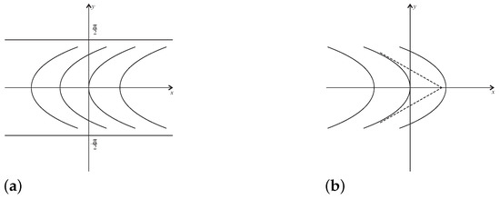 within the translation on x and dilatation on x and on y. It is even with respect to y and by translation on x cover the flow domain. At the stream lines give the turn back of the flow in the strip (Figure 2a). At we obtain the turn of the flow on the plane with the asymptotes for the stream lines (Figure 2b).