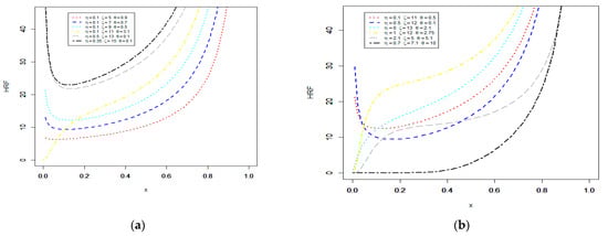 Several shapes for the E-NPF density and failure rate functions are displayed in Figure 1 and Figure 2 for various choices of the parameters. Note that the possible shapes of the PDF corresponding to the parameter , which controls the scale of the distribution, along with the two shape parameters and , which control the shapes of the distribution, including increasing, symmetric, upside-down bathtub, decreasing, and J shapes. These shapes are presented in Figure 1a,b. Furthermore, Figure 2a,b presents the hazard rate function (HRF) shapes, including increasing, U, and bathtub shapes. These flexible HRF shapes are suitable for both the monotonic and non-monotonic hazard rate behaviors, which are most likely to appear in real-time situations (see Pu et al. [27] and Oluyede et al. [28]). Such kinds of shapes are often observed in non-stationary lifetime phenomena.