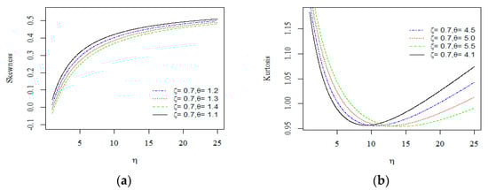 Plots of the skewness (a) and kurtosis (b) of the E-NPF distribution.