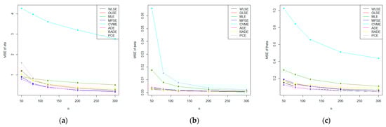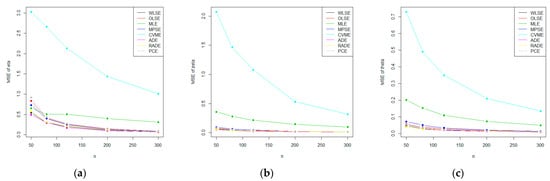 Plots of the mean square errors (MSE) of the E-NPF parameters for the eight methods of estimation using the values in Table 5 (a–c).