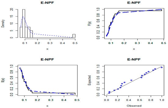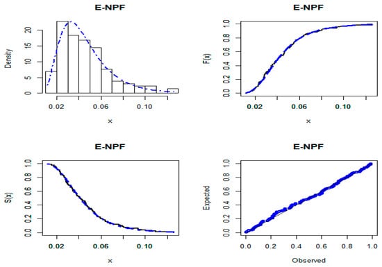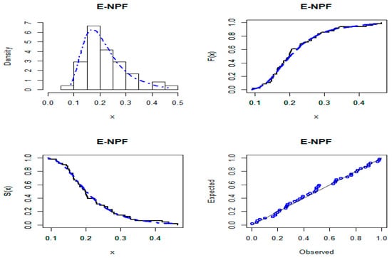 Furthermore, the empirically fitted plots of the PDF, CDF, Kaplan–Meier survival, and probability–probability for the three datasets are presented in Figure 6, Figure 7 and Figure 8, respectively. These plots confirm the close fit of the E-NPF distribution to the three datasets. The numerical results in this section are calculated using the statistical software under the package Adequacy Model [37].