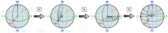 The effect of applying an H q-gate over a qubit represented on the Bloch Sphere can be seen as “first rotating an angle of radians around the Z axis and then rotating an angle of radians around the Y axis” (fully equivalent to “first rotating an angle of radians around the Y axis and then rotating an angle of radians around the X axis”, which are the movements made by H in Figure 1). Hadamard q-gate application changes a qubit from a computational basis to a Hadamard basis. To better understand the effects of the sequence H-S-H we start, as usual, from a qubit initialized to , i.e., located at the north pole of the Bloch s. which, moved through a Hadamard gate, gets located at the equator of the Bloch s., specifically on the X axis, in the position usually known as a , which corresponds to the qubit