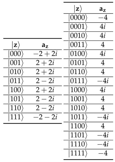 Figure 3 captures on the Quirk simulator the instance of the PP where elements in are and depicted in rows 1–2, 3–4 and 5–6, bottom-up referring to the number of the rows as well as the significance of the qubits. The 7th row is used for the control qubit. Rows 8–11 encode which in two’s complement is represented with four bits (bootom-up). The last three qubits are used to be set on the superposition as usual.