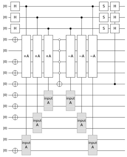 Let us denote by . Notice that S belonging to is a requirement for PP to have a solution. We use the two’s complement representation of , so requiring for it qubits. Then for each , we use qubits to encode . These qubits will remain constant in every phase of the circuit and therefore we will not consider them in the rest of the discussion. As usual, we use n qubits to encode a subset of E, i.e., if is the state of those n qubits, then an element e, , is included in the set if and only if . We will use m qubits, denoted in the following by , to store the sum for the elements selected in . In this way for a solution of the PP. Qubit is used for control purposes.