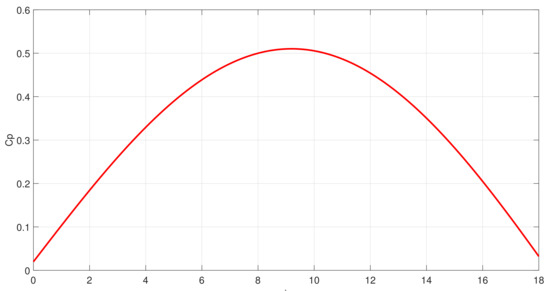 It is widespread to represent as a function of tip speed ratio and the blades pitch angle ; exponential, polynomial, and sinusoidal representations have been widely used by diverse authors [22]. In this work, a sinusoidal representation was used as shown in Equation (3). The values of the coefficients that were selected are indicated in Table 1, while the selected pitch angle was zero. Figure 1 represents the associated curve to Equation (3) considering a typical operational span of tip speed ratio.