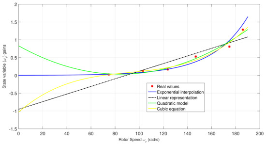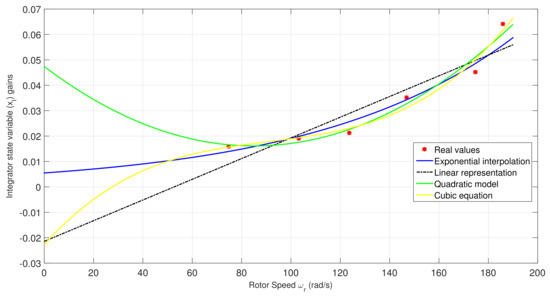 In the second place, an exponential and three polynomial approaches were established using interpolation based on , which also depends on wind speed. Dynamic gains are calculated as functions dependant on this speed (). Equation (14) shows the exponential function for while Equation (15) corresponds to the function for calculating .