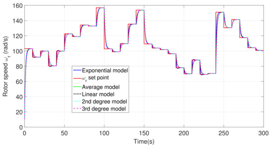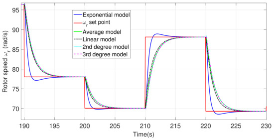 Excluding the exponential model, the performance of the other models was very similar. Table 8 shows the standard deviations of every model from two perspectives. In the first, the difference between optimum rotor speed and the instantaneous rotor speed for every gain scheduling model was calculated (absolute error); then, the standard deviations of the whole span were determined. In the second, the absolute error was calculated in the first three seconds after applying every one of the 30 rotor speed steps; this represents approximately the average time for the exponential function to reach the steady-state. This error was used to calculate a more representative standard deviation.