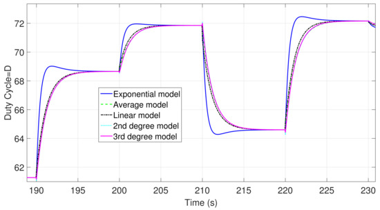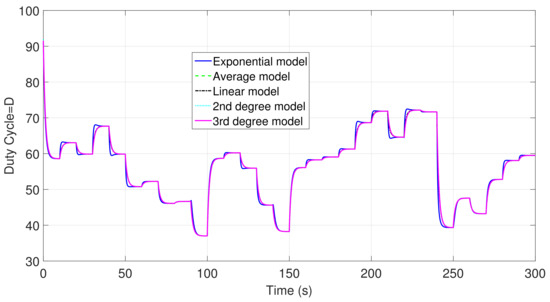 To show a better perspective of the proposed model’s performance, Figure 8 presents four changes of optimum rotational speed correspondent to wind changes between 190 and 230 s. As it can be seen, the exponential model presents better behavior with respect to the other models not only in the decreasing intervals but also in the increasing ones; in addition, Figure 9 presents the duty cycle related to each proposed model in the whole time span, while Figure 10 shows the duty cycle associated to everyone on the dynamic gains mathematical models from 190 to 230 s as well as the average model just as an example for having a better perspective.