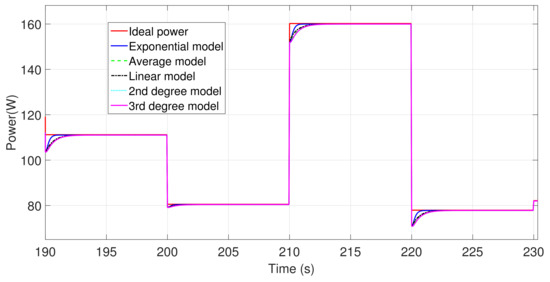 Finally, Figure 11 shows the ideal power as well as the instantaneous power for every proposed model for the entire interval (0–300 s). It can be noticed that the proposed models’ power curves are very similar to the ideal power graphic, so maximum power is rapidly reached. On the other hand, Figure 12 presents the ideal power and instantaneous power curves in the interval 190–230 s to have a better appreciation of the different models’ performance. As it can be seen, the exponential model provides the best results.