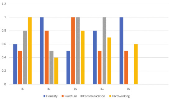 Here, we will make a model-based example on m-PFS, and use it to conveniently select an appropriate employee in a company. Here, the selection of an employee is based on 4-PFS with their four qualities, which are honesty, punctuality, communication skills, and being hardworking. Let be the set of five employees in a company. We shall characterize them according to four qualities in the form of 4-PFS, given in Table 1: