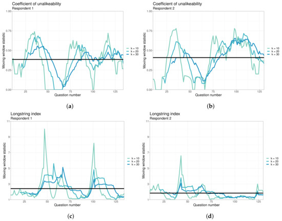 where k represents the period of the moving-window metric. Thus, the jth element of the moving-window metric is computed by applying either or to the set of k responses spanning from response to response j. The choice of a small k provides an accurate picture of the level of attention offered by the respondent, based on the two metrics considered, but it also can result in noisy time series. Conversely, choosing a value of k that is too large could render it impossible to observe any trend. For this reason, an intermediate value of k should be chosen, depending on the number of questions available in the survey. The main functions that were built in R to study careless responding attitudes among respondents are provided in Appendix A.