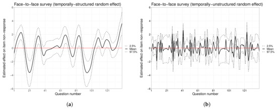 Estimation of the structured (a) and unstructured (b) temporal random effects considered for modeling item non-response values in the face-to-face survey. These estimates correspond to (a) and (b) according to Equation (2).
