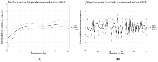 Estimation of the structured (a) and unstructured (b) temporal random effects considered for modeling item non-response values in the telephone survey. These estimates correspond to (a) and (b) according to Equation (2).