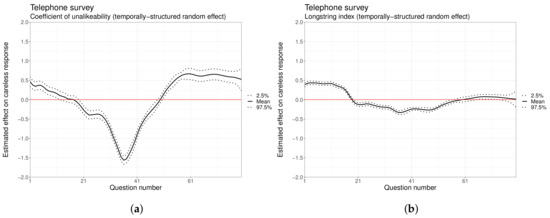 Furthermore, in order to evaluate if the incidence of careless responding might be affected by a respondent burden effect, the estimates corresponding to the temporal random effects defined in Equations (4) and (5) are analyzed. Figure 5a and Figure 6a display the estimation of the structured temporal effect implicated in the modeling of the coefficient of unalikeability, whereas Figure 5b and Figure 6b show the analogous estimation that corresponds to the modeling of longstring index values. The interpretation of the temporal random effects in the case of the careless response rates is more challenging than in the item non-response rates, and the two moving-window metrics defined partially disagree with one another. In particular, the temporal effects estimated on the telephone survey (Figure 6) are quite similar for both metrics: the estimates are positive at the beginning of the questionnaire until, approximately, question number 20, they start to decrease and become negative at the central part of the questionnaire and grow again towards positive values from approximately question number 50. However, given that observing higher values for the coefficient of unalikeability means the opposite compared to observing higher values for the longstring index, it is very hard to conclude about respondent burden effects on careless responding. Nevertheless, it may be worth noting that the longstring index showed a tendency towards higher values at the beginning of the telephone survey, whereas the coefficient of unalikeability displayed a similar behavior at the end of the telephone survey. In the case of the face-to-face survey, no clear trend is appreciated for any of the metrics (Figure 5). However, the variability of the estimated temporally-structured effects is remarkable (Figure 5b), displaying multiple peaks and valleys throughout the questionnaire. Hence, although there is no evident relationship between question number and careless response rates, it seems clear that careless response rates evolved since the administration of the questionnaire started. Indeed, the values, which account for the contribution of random effects to model fitting, are considerably higher than the values (Table 4 and Table 5).