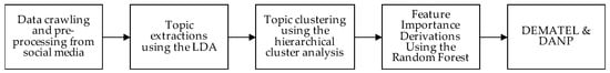 Several multiple criteria decision making (MCDM) methods have been developed in the past few decades. These include the analytic hierarchy process (AHP) [10], the analytic network process (ANP), decision-making trial and evaluation laboratory (DEMATEL) [10], and the DEMATEL-based analytic network process (DANP) [11,12]. The AHP and the ANP have been used to measure the weights of the components of the structure by pairwise comparisons, and then to rank the alternatives in the decision. AHP structures a decision problem into a hierarchy with a goal, decision criteria, and alternatives, while the ANP structures it as a network. DEMATEL is a comprehensive method for building and analyzing a structural model involving causal relationships among complex factors. These methods have been applied widely to numerous decision-making problems, which include economics, management, engineering, environmental science, etc. These methods were adopted to derive the weights associated with certain aspects or criteria. Meanwhile, the influence relationships, as well as the influence weights, have further been proposed and widely adopted. These MCDM-based methods can actually give insights into decision-making problems, e.g., the influence relationships and influence weights, which statistical methods-based analytic frameworks cannot afford. The integration of MCDM methods with big data analytics in general, and social media mining in particular, has been rare. However, their integration can indeed derive very different results compared to those methods that integrate big data analytics with a statistical analysis method, e.g., social media mining with PLS-SEM.