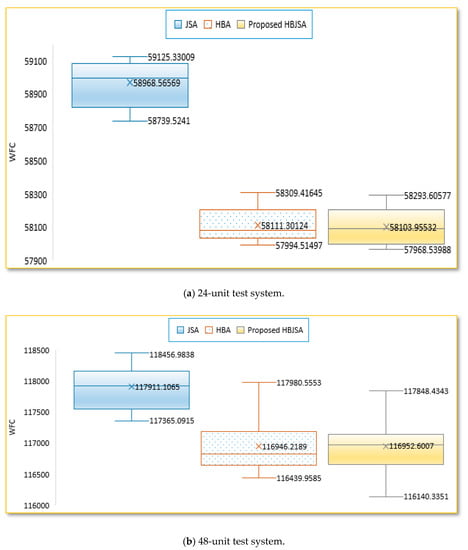 The data for the obtained system are mentioned in [40], which illustrates that 2350 MW and 1250 MWth are the load demand and heat demand, respectively, and it has five heat units, 13 thermal units, and six CHP units. The HBA, JSA, and proposed HBJSA are applied on this test system, and the corresponding MW, MWth for each unit, and WFC are demonstrated in Table 1. It can be manifested that the proposed HBJSA provides the optimal solution for WFC minimization, which accounts for USD 57,968.5399, while the standard HBA and the standard JSA account for USD 57,994.51 and USD 58,739.5241, respectively.