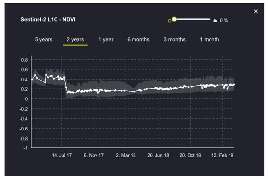 EO Browser shows the tendency of NDVI for a certain area affected by a severe wildfire.
