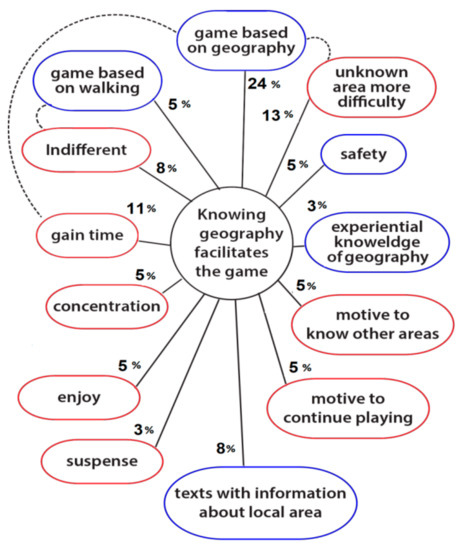 The thematic “knowing the geography facilitates you to play the game better” was found to be related to 13 subthemes, as follows: it is decidedly a game based on geography, it gives motivation to continue playing, unknown areas are associated with more difficulty, knowledge of the area helps to gain time, the game has suspense, there are texts with information about the local area, the game can be enjoyable, it gives a sense of safety, requires concentration, can be indifferent, is based on walking, experiential knowledge of geography helps the user play it better, and it motivates the user to know other areas (Figure 1). Percentages correspond to the number of mentions in the participants’ responses related to the main thematic “knowing geography facilitates the game”.