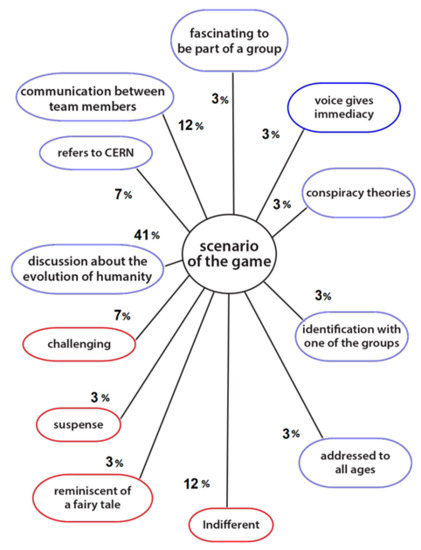 Subthemes with percentages of mentions related to the main thematic “scenario of the game” (question 2). Subthemes in red relate to the user, those in blue relate to society, and those in dark blue relate to the game.