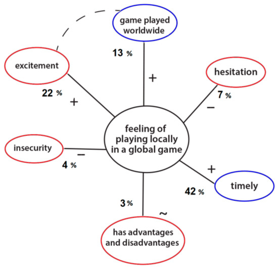 Specifically, the content analysis of the responses to question 3 showed that the thematic “the feeling of playing locally in a global game” was related to six subthemes (Figure 3): excitement, current, game played worldwide, hesitation, insecurity, and has advantages and disadvantages.