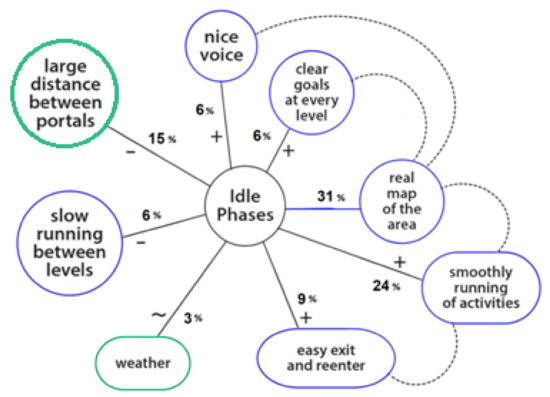 Subthemes (with percentages of mentions) related to the main thematic “idle phases”, as derived from the content analysis of the responses to question 4. The subthemes “clear goals at every level”, “real map of the area”, “smoothly running of activities”, “easy exit and reenter”, and “weather” were mentioned more than once by the participants, who also mentioned the subthemes that are connected with dotted links. Subthemes in blue relate to the game, and those in green relate to the environment. The signs +, −, and ~ represent the learners’ disposition towards the subtheme to which these signs relate (positive, negative, and neutral disposition, respectively).