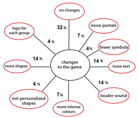 The thematic “changes to the game” was related to nine subthemes, as follows (Figure 5): more shapes, more intense colors, more texts, louder sounds, not personalized shapes, logo for each group, more portals, fewer symbols, and, expectedly, some responded that no changes would be necessary (32%).