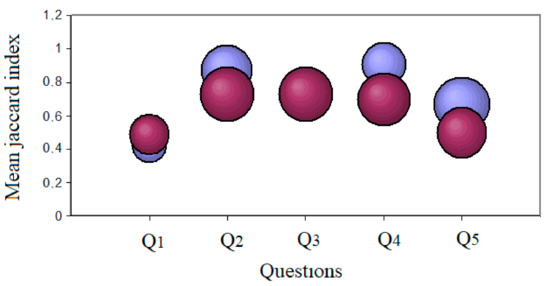 Values of the mean Jaccard index (with their standard deviations) per question, for the comparisons between the 20–35 and 36–51 age groups (purple balls) and 20–35 and >52 age groups (blue balls): the 20–35 and >52 age groups had higher means of agreement than the 20–35 and 36–51 age groups for all questions except for question 1.