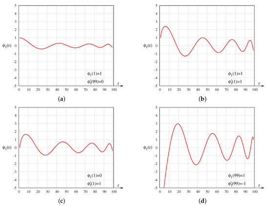For the numerical evaluation of , we normalize the amplitude and choose the fixed frequency , as well as a length scale and a constant speed . In the graphical representations, Figure 1, we select several distinct boundary conditions, allowing for different configurations to exhibit the propagation behavior for the concentric prototype waves traveling on the Einstein cylinder. The radial dependence will be examined in the interval from to . Thus, the boundary conditions are conveniently chosen on the radial positions and in order to avoid the two singular points at and of the underlying differential equation, Equation (17).