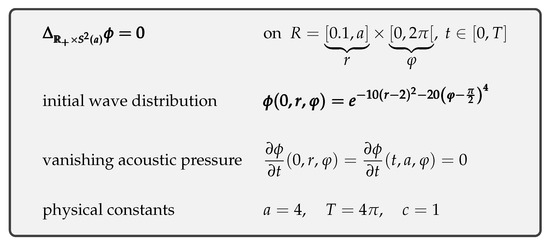 Given the precise analytical result for concentric wave propagation, viz., Equation (15) with Equation (26), we may now proceed with numerical wave simulations to further explore the properties of the underlying acoustic space possessing all analogue features of the spacetime of the Einstein cylinder . Apart from the time-harmonic dependence of the wave potential, only the non-trivial radial dependence is of interest.