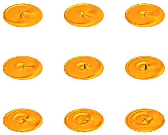 Figure 3 directly shows in graphical form the numerical results for the boundary-value problem of the wave equation on the Einstein cylinder, Figure 2. With final time , the snapshots which examine the waves during the time are computed at each multiple of . Figure 3 depicts the nine frames .