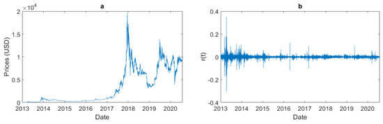 The database, retrieved from the Bitcoincharts API website (http://api.bitcoincharts.com/v1/csv/ (accessed on 28 July 2020)), contains the trading information on bitcoin from one of the main bitcoin online exchanges—Bitstamp. The data file contains the timestamp in Unix time, the trading price in USD, and the trading volume in bitcoin units. A significant part of these volumes is not integers, because bitcoin may be traded in multiples of of a bitcoin, i.e., a satoshi. These raw data were then sampled considering the last price before each minute observation point. The final data are formed by 3,981,601 1 min observations covering the period from 1 January 2013 to 26 July 2020.