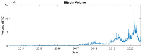 To obtain a more complete picture of what has happened with bitcoin, namely in terms of trading intensity, we also looked at the historical data of the daily volume of the overall bitcoin market. These data were collected from CoinMarketCap from 29 April 2013 to 30 July 2020 (2650 observations). This site provides aggregated data of eligible online exchanges on daily opening, lowest, highest, and closing prices (which are commonly referred to as OLHC prices); volume; and market capitalization, all in USD. The daily volume in bitcoin units is estimated by dividing the volume in USD by the average of the OLHC prices. Figure 3 plots the daily volume.