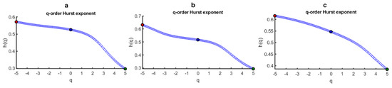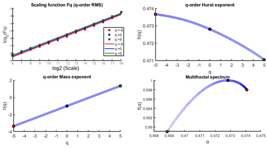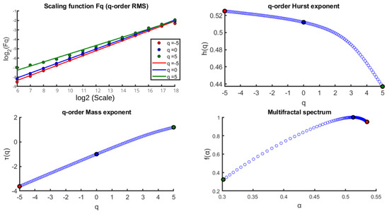 To apply MF-DFA, we use the following parameters: (1) the scaling parameter ranges from to in powers of two, (2) q ranges from −5 to 5 with a step of 0.1, and (3) the polynomial order is . According to [51], one should choose , where N is the length of the time series. Here, the minimum and maximum scales were chosen to be powers of two between those boundaries.