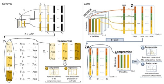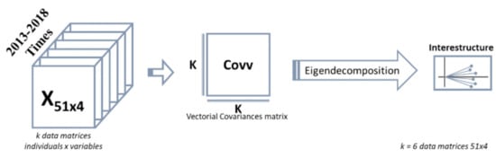 Figure 2. Compromise analysis flow chart in X-STATIS. - The intrastructure study (Figure 2) analyses the evolution of individuals and variables in time by projecting rows and/or columns of each k table on the “compromise” subspace. Let be the first eigenvectors matrix from the compromise analysis; the co-ordinates of the rows of table are the rows of , and the co-ordinates of the columns are the rows of , where is the first eigenvector of . The study of the trajectories allows us to represent, on a two-dimensional plane, the individuals and variables from each of the k tables by projecting their values on the compromise subspace. This shows each country’s evolution individually from 2013 to 2018. This information is of great interest as we can use it to investigate which countries are stable in this period and compare them with their position on the Paris MoU lists; equally, countries that display abrupt or significant changes in certain years would be interesting to study individually to determine the reason these changes occurred. Finally, all this information is of potentially significant use in classification and in the study of each country’s position on future Paris MoU lists.
