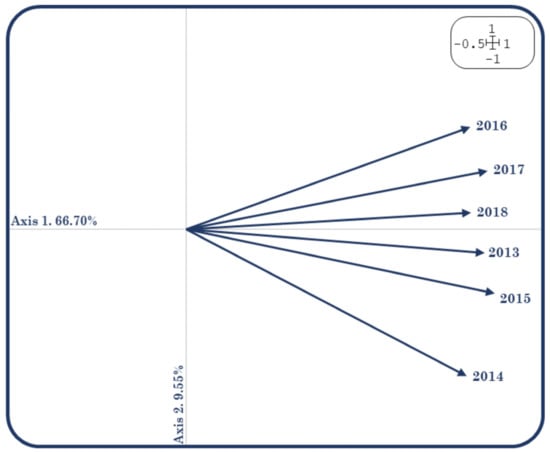 In this application, the first step is to compare the structures of the different years via the three-mode X-STATIS interstructural analysis (1st mode: 51 countries, 2nd mode: four variables, 3rd mode: six years). This analysis provided a graphical estimation of the vectorial correlation coefficient between matrices, i.e., between years (Figure 3). As shown, the angles between vectors are narrow, signifying strong relationships and similarities between years, although we observe a slight separation between the first three years (2013–2015) and the last three years (2016–2018). This representation exhibits structural similarities across years and contains about 76% of the information in the 1–2 factorial plane. A positive conclusion from this analysis is that it validates the choice of the PSC inspection variables as they are strongly correlated, irrespective of the year.