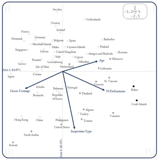 The different countries display high variance and are distributed all over the plane, which facilitates the visualisation of differences according to the ship country registrations. The positions of the countries are based on the structure of the variables, which display a clear tendency. As depicted, there is a clear relationship between a ship’s age “Age” and the number of deficiencies detected “NDeficiencies”; that is, older ships generally have more deficiencies. The results are interesting as the relationships between variables can be used to identify a substandard ship profile []: older, smaller ship (“Age” and “GrossTonnage” are inversely related) with a high number of deficiencies detected in inspections. Ultimately, we can use the structure obtained with these variables to identify ships that are a high risk in terms of maritime safety.