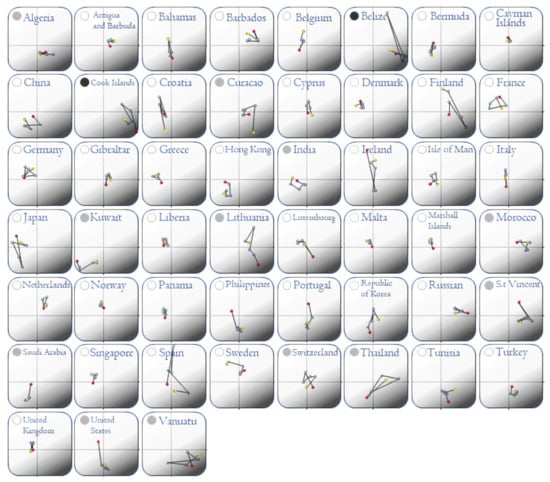 A fundamental step of the X-STATIS analysis is the study of trajectories, which describes the evolution of the countries on an individual basis from 2013 to 2018. Figure 5 illustrates these trajectories in the compromise subspace, where grey and black list characteristics appear in the 4th quadrant. Each point represents a year, the first year, 2013, appears in red and the last year, 2018, appears in yellow.