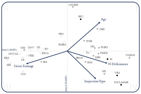 In Figure 6, the grey, black and white coloured points represent the corresponding Paris MoU classification societies’ performance lists (white: high performance level; grey: medium performance level; black: low–very low performance level). As shown, there are differences between the variables depending on the classification certificate of each ship. The variables maintain the same structure as the previous analysis, although the relationship between inspection type and number of deficiencies is stronger. These two variables characterise the fourth quadrant, which means that certificates located in the quadrant have a larger number of deficiencies and are thus subjected to more exhaustive inspections. In contrast, certificates in the second quadrant have fewer deficiencies and are therefore subjected to less in-depth inspections. The variable GrossTonnage dominates the third quadrant, which indicates that certificates in this quadrant mostly represent large and young ships, while in the first quadrant the opposite holds.