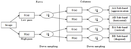 where and refer to the approximate and detail components, respectively. The parameters j and k represent wavelet scale and translation factors, respectively. The functions and represent the low-pass and high-pass filters, respectively. It combines these High-Pass and Low-Pass filters and then downsamplers (DS) by a factor of two. The filter bank approach DWT when applied to MR image, the sub-bands obtained after two stages is shown in Figure 1. Four different sub-bands are AA for (LOW–LOW), AB for (LOW–HIGH), BA for (HIGH–LOW), and BB for (HIGH–HIGH), and they are obtained as shown in Figure 1.